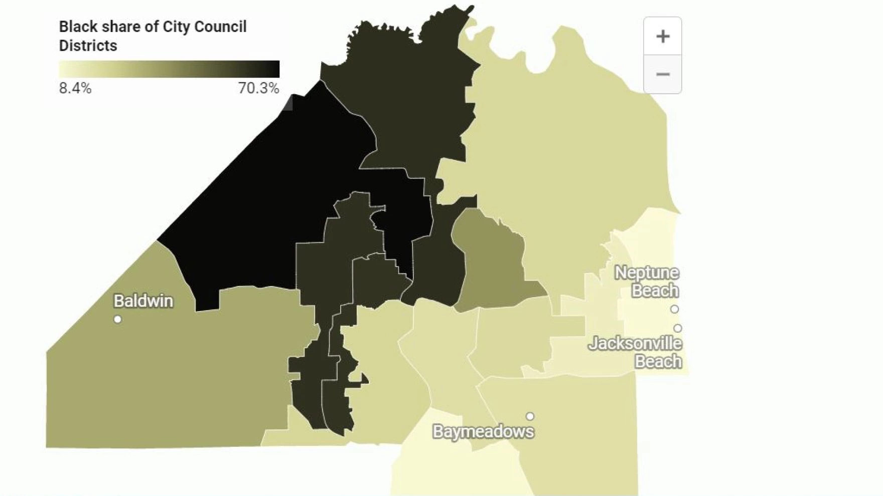 Jacksonville’s districts are Republican by design. Florida Governor Ron DeSantis, who seized control of the redistricting process from the state legislature after the 2020 Census, intentionally split the city along the river into two House districts, cracking its Democratic urban constituencies and diluting their votes with large infusions of rural Republican voters. The city council packed Black Democrats into four supermajority seats, leaving enough Republicans in surrounding areas to ensure that the GOP majority remains in power, a move that a federal court determined to be unconstitutional racial gerrymandering.